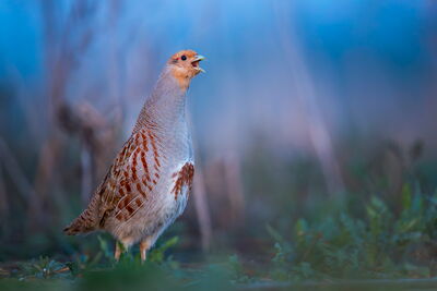 Beim Rebhuhn (Perdix perdix) hört man, was Sache ist: Ob in heutiger Schreibweise, als „Rep- oder als Repphuhn“ in älteren Quellen, sein deutscher Name wie auch die wissenschaftliche Bezeichnung Perdix perdix gehen direkt auf den markanten Revierruf des Männchens zurück: Mit seinem rauen, schnarrenden Ruf macht das Rebhuhn in den frühen Morgen- und späten Abendstunden deutlich, wem das Feld gehört – und liefert damit gleich selbst die Erklärung für seinen Namen. Der individuell leicht unterschiedliche Ruf wird gelegentlich mit dem Knarren einer rostigen Türangel verglichen. Aus größerer Entfernung klingt er allerdings weicher und melodischer. Der Revierruf ist überwiegend im Spätwinter und im Frühjahr zu hören.