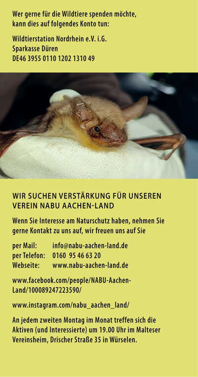 August 2025: Das NABU-Telefon des NABU Aachen Land klingelt: „Ich habe auf meinem Balkon eine Jungfledermaus gefunden. Sie ist sehr schwach. Können Sie hier helfen?“ Der NABU ruft den Arbeitskreis (AK) Fledermausschutz an. Zum Glück gibt es hier noch einen Aktiven, der die Jungfledermaus artgerecht vom Balkon in die Pflegestube bringen kann, wo sie aufgepäppelt und bald wieder am Fundort ausgewildert wird.