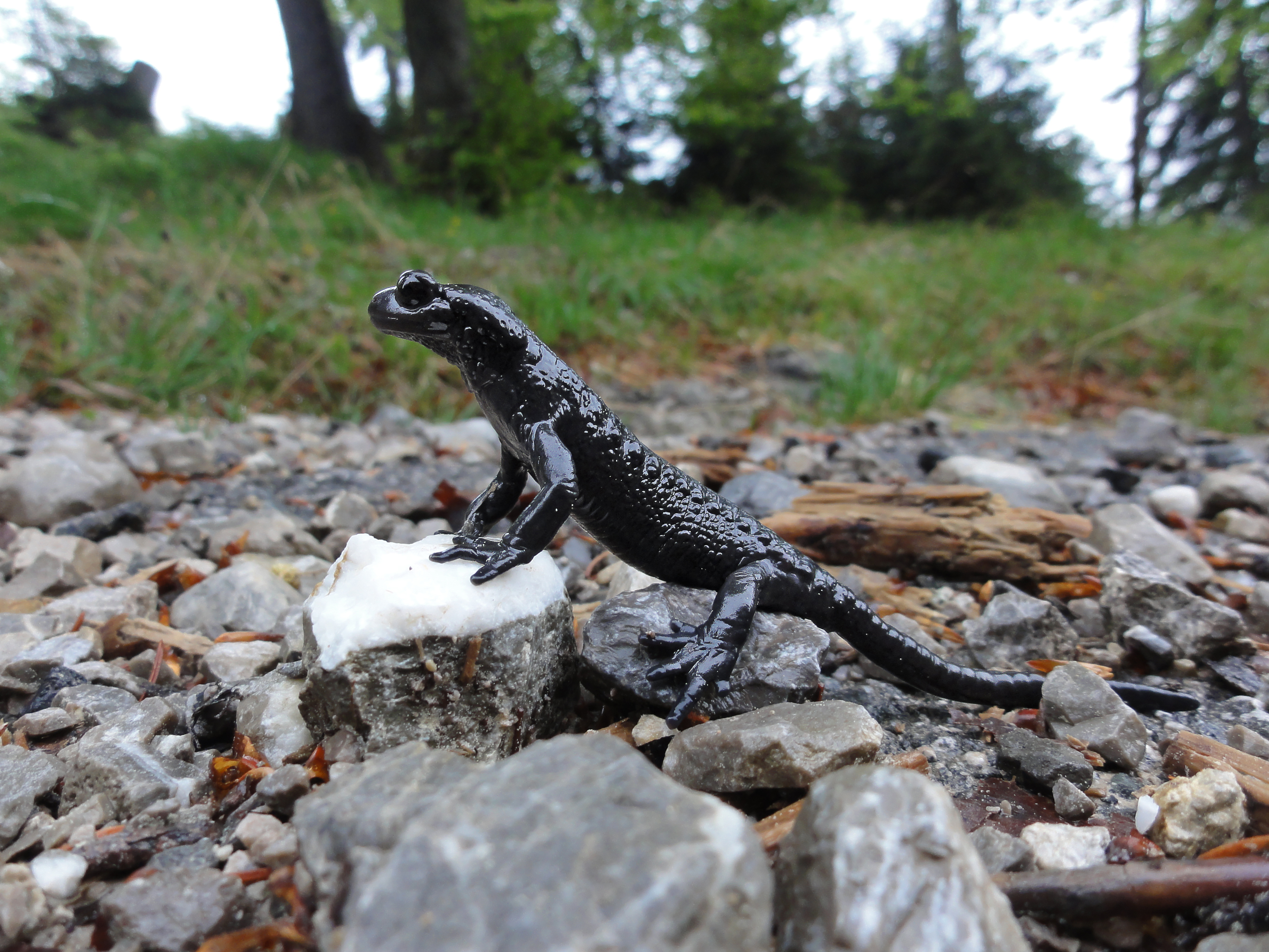 Der Alpensalamander (Salamandra atra) ist 12 bis 16 Zentimeter groß und einheitlich schwarz glänzend gefärbt. Die Männchen erreichen nicht ganz die Größe der Weibchen. Unterseits sind die Tiere bleigrau gefärbt. Ihre Gestalt ist insgesamt zierlicher als beim bekannten Feuersalamander.